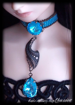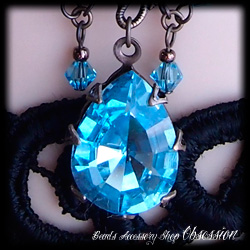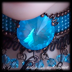 Dragogna 第2弾、Rivoli カボション・バージョンでございます! デザイン目玉のひとつ目はチョーカー・センターのスワロ・ヴィンテージ・浅円錐16面カッティング・カボション "Rivoli/リヴォリ"☆ そしてふたつ目はフレンチ・スタンピング・プレートです☆ コレはモゥこれだけで芸術作品と言っても過言ではない完成度 (≧▽≦)♪ あんど、みっつ目はスタンピングの先から零れ落ちますようにセットしましたヴィンテージ、大振りなペアシェイプ・カボション☆ 薄暗がりでも真価を発揮します涼やかなお色、アクアマリン色でございます。これらの美麗な素材たちをランセット/鋭尖アーチのアウトラインで包み込みました☆ 宵闇に浮かぶ玲瓏たる月のように輝きます Rivoli を、ぜひご堪能くださいませ☆
